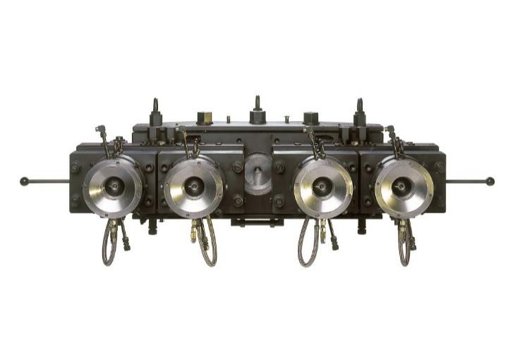 The four- or two-die pipe heads, specially developed for foam pipe systems, reduce the line speed at constant throughput. In addition, Die changes can be made without interrupting production, because the flow channels can be individually shut off or adjusted. Various pipe dimensions, profiles, and rods can consequently be extruded simultaneously.